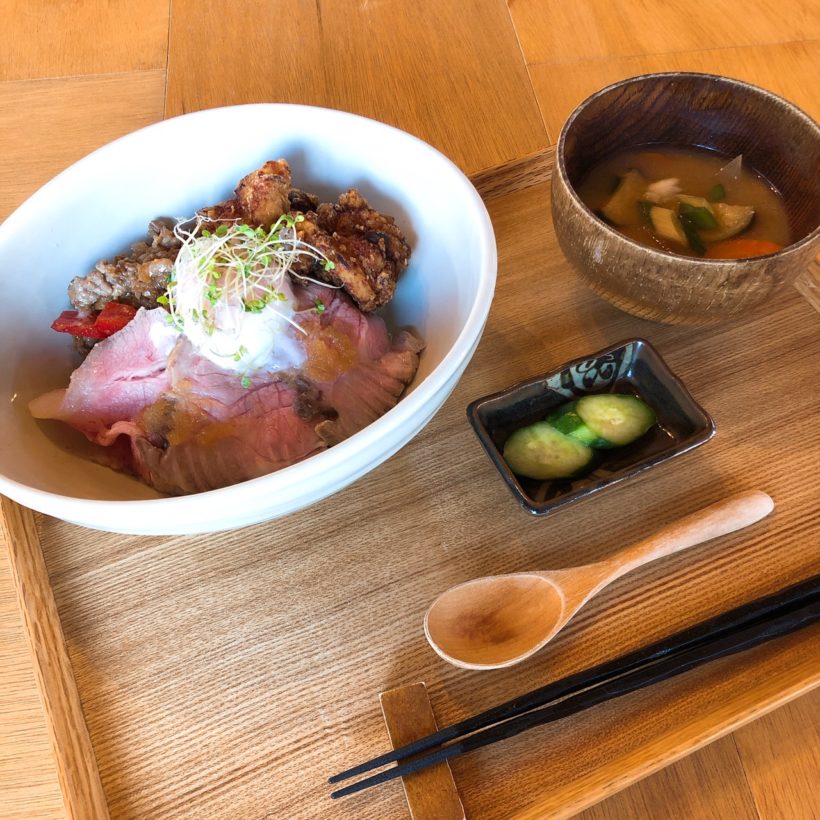 奥さんの肉丼は対照的にがっつり系。私と奥さんのメニューは逆な感じがしますが笑。ローストポーク、唐揚げ、牛肉酒かすみそ炒めの3種の肉が盛られている贅沢丼。ローストポークが柔らかくて美味しかった。