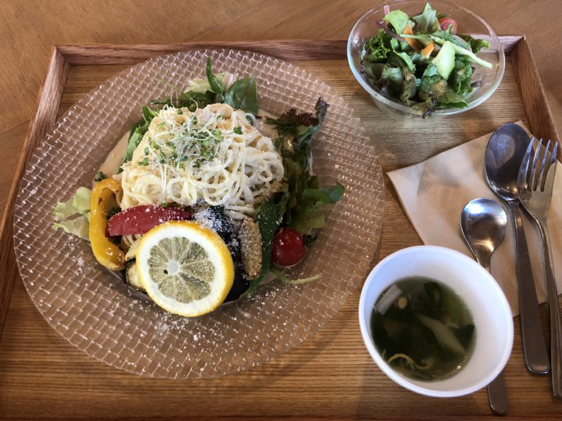 地元野菜をたくさん使った冷製パスタはゴマダレがゴマのいい香りがします。いろんな種類の野菜が使われていて彩りが良い。さらにサラダも付いてくるのでこれだけで多くの野菜を摂取できました。野菜不足を感じていたのでちょうどよかったです。体質改善中でもあるので今の私にぴったりのメニューでした。