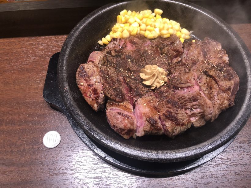 100円を対比として置いてみましたが伝わるでしょうか?大きすぎです・・・。肉の厚さも2㎝くらいある。