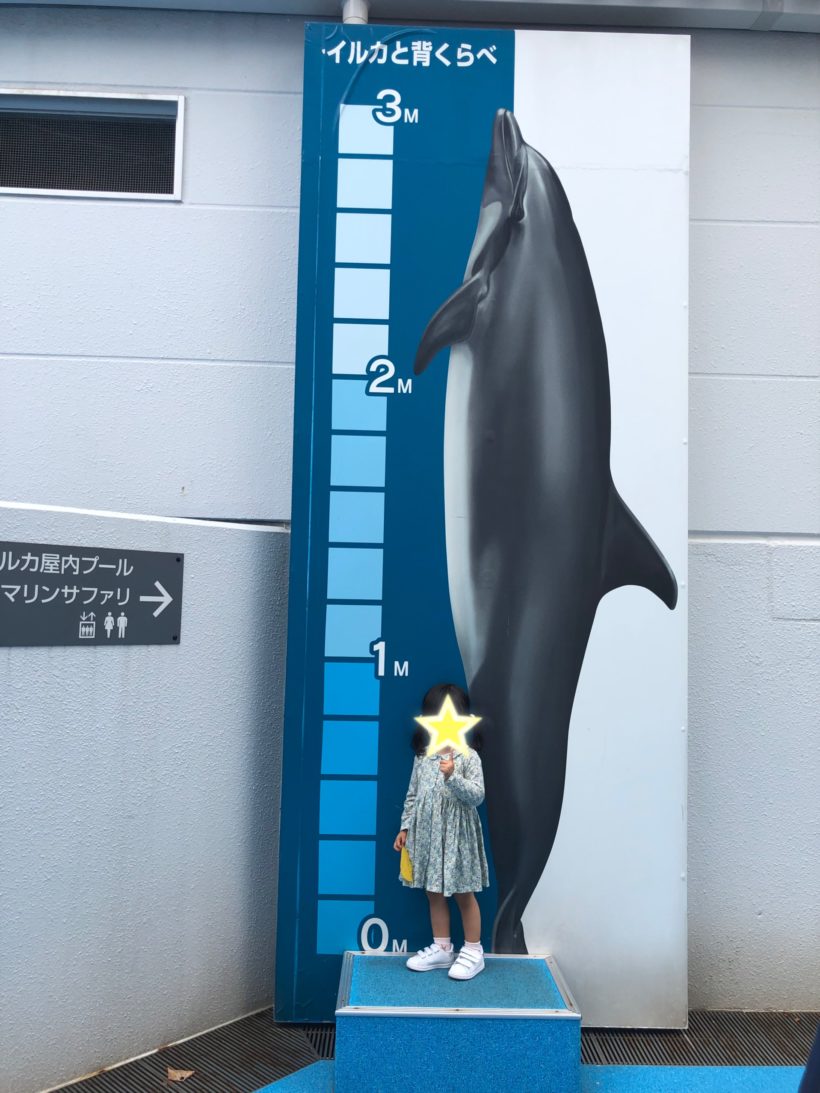イルカとの背比べ。イルカってでかいんだなぁ。長女ももうちょっとで100㎝かぁと思い、大きくなるのは早いな、と。