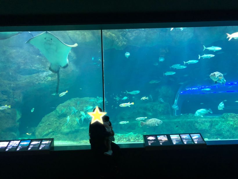 入り口から入ると、いきなりちょっと暗めの鑑賞スペース。前回初めて来たときと同じように長女は怖いようでお母さんにぴったりくっついて離れません笑。