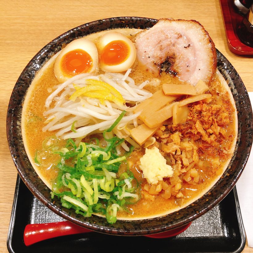 通常の吟醸味噌らーめんに、炭火焼チャーシュー、ネギ増し、味玉がトッピングされています。