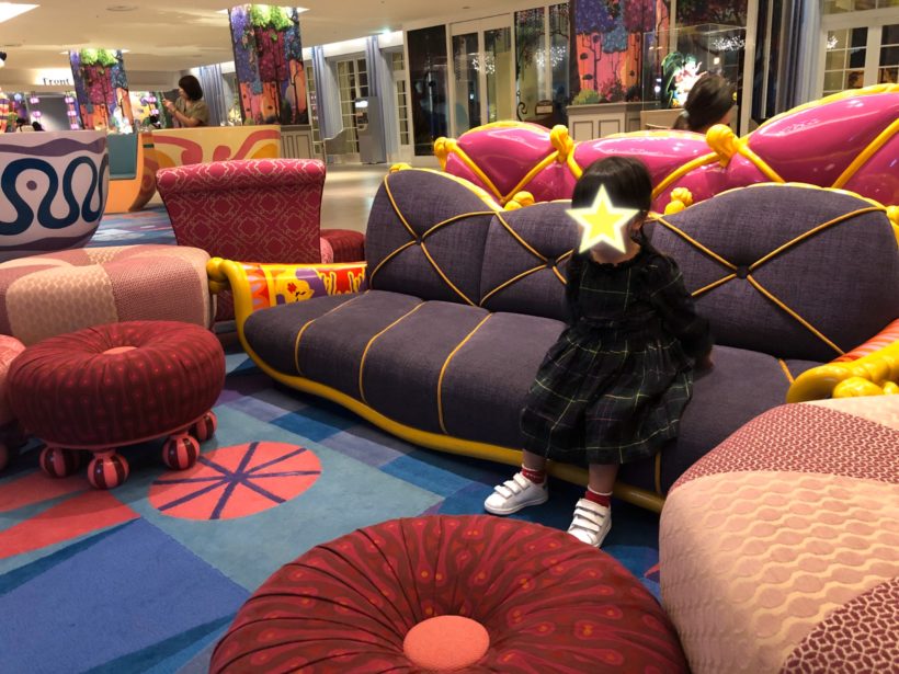 ロビーのテレビにディズニーチャンネルが映されていて、チェックイン待ち時間もソファに座ってテレビを見て待っていられます。因みにディズニーチャンネルは宿泊部屋でも観ることができます。