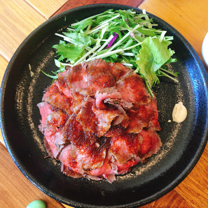 個人的に最近ローストビーフにはまってます。冷たいお肉にあったかいご飯がとても美味しい。