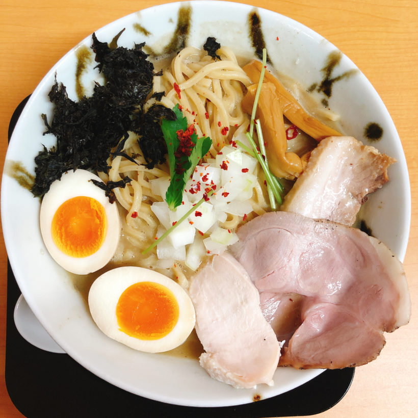 「特製」だとレア、豚バラ、鶏の3種類のチャーシューと、岩ノリ、煮卵がトッピングされています。