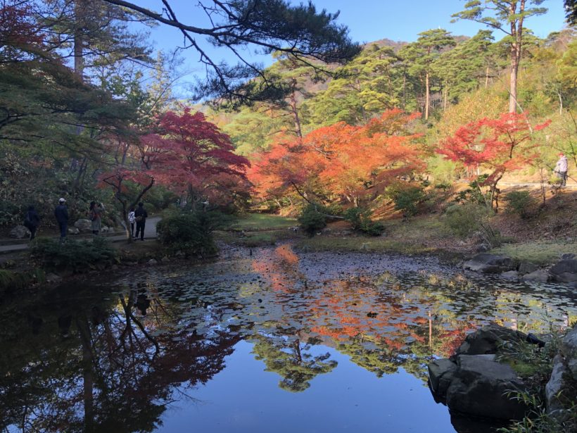 風もなかったので、池には紅葉と青い空が写ってとてもいい景色。