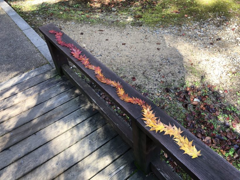 谷の橋では誰かが並べた紅葉したもみじのグラデーション。