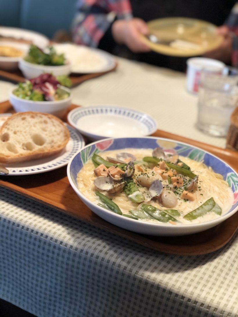 パスタランチはトマトソース、クリームソース、オリーブソースの3種類から選べます。今回はクリームソースにしましたが、大当たりでした。具だくさんのスープパスタです。貝や鮭などがたくさん入っています。スープパスタを提供しているお店はあまり知らないのですが、おいしいですね。パスタは極細麺。これがスープパスタと相性がいい。他のソースも気になりますね。