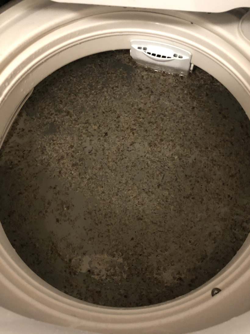 洗濯層の裏側に洗剤や衣類に着いた汚れが残っていて、そのまま乾いて付着してしまっていることがあります。また、湿気こもるのでカビも生えますね。