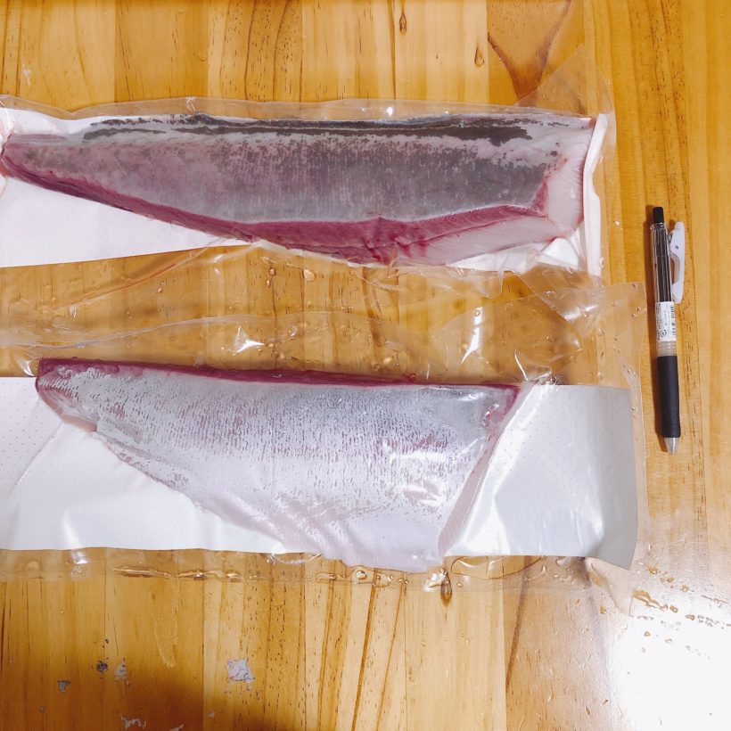半身は腹と背に分けて真空パック状態で。冷凍ではなく冷蔵状態なのでそのまま切ればすぐに食べられます。