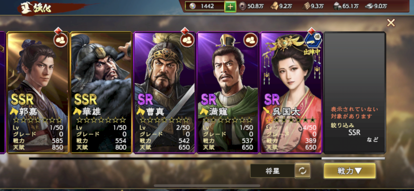 どうせ使っていないなら、SSRでもSRでも交流ポイントにするのです。SSRは12000ポイント以上の交流ポイントに変換できます。これで育成したいSSRの武将の将星を上げるためのポイントに変換してしまえばいいんです。