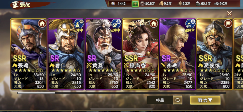 張遼は初期のキャラで天賦850と強いので一番育っている印象。将星という星が最高7つ付くのですが、これは同じキャラクターをガチャで引いてポイントを稼がないと付かないんですよね。ポイントの稼ぎ方は他にもありますが手っ取り早いのがガチャで同じキャラクターを引くこと。なのでガチャを回したくなります。
