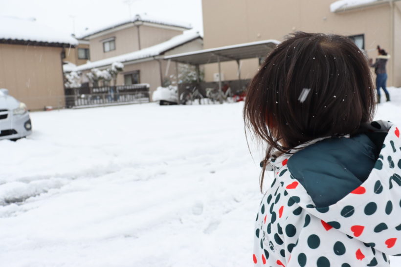 アパートに帰ってきてその日に雪かきして、次の日も雪かきしてました。という事でせっかくなので子供も外で遊ばせることに。という冒頭の写真です。