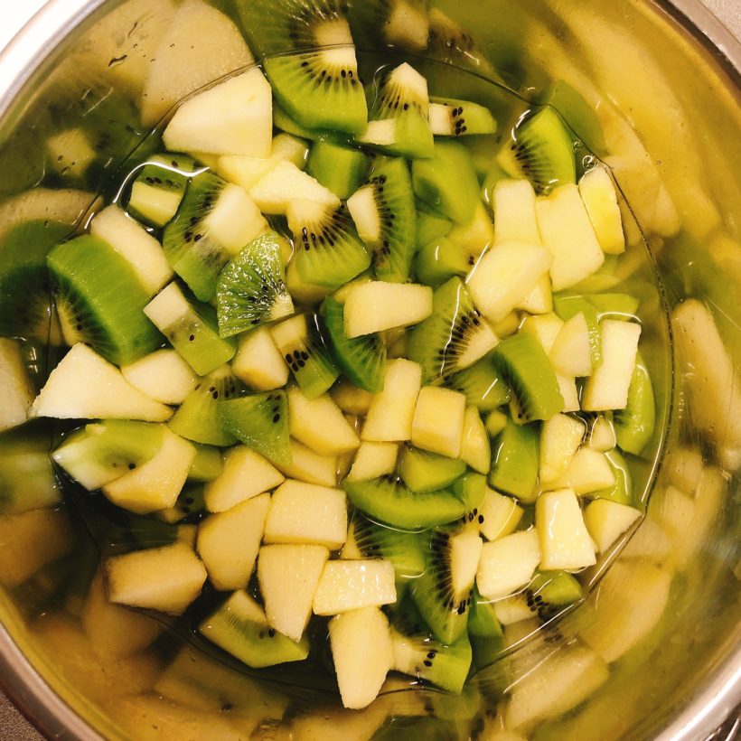 今回は直売所で買った国産キウイとリンゴを仕込みました。シロップは水200ml、砂糖大匙1.5、レモン汁大匙1くらいを適当に。