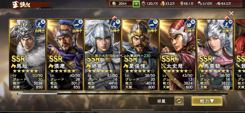 馬超はすでにレベルもグレードもMAX。あとは将星ランクがもう一つでMAX。最後は3000ポイント必要なのでなかなか貯まらないですが、粘り強くがんばろ。