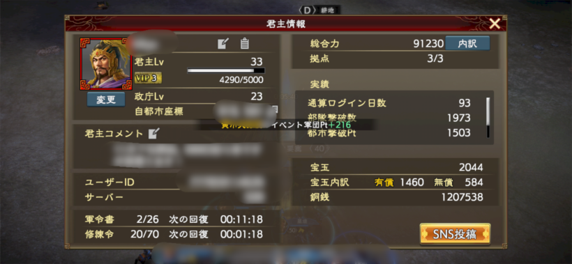 君主レベルは33。総合力は91000くらい。これがどんなものなのかはわからないですが、内政が進んでいると総合力は上がるのでまだまだ足りないのでしょうか。