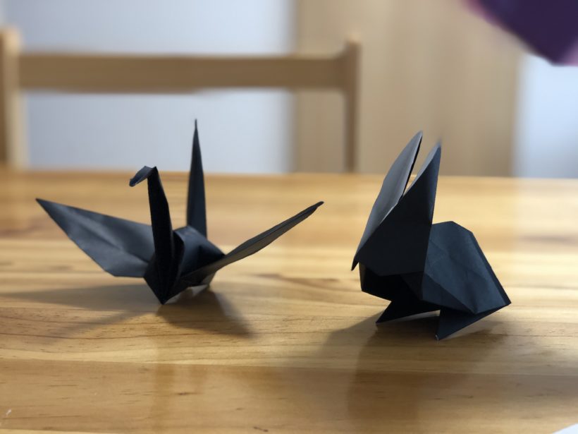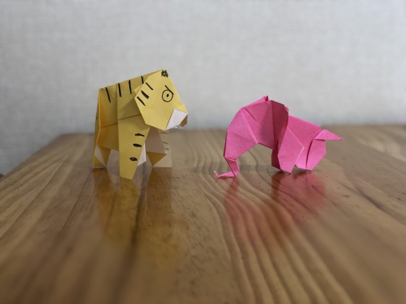 鶴、ウサギ、トラ、象を折りました。なんとなくわかる感じ。