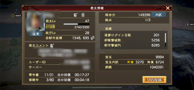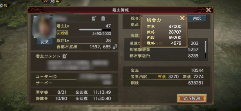 総合力はなかなか上げられないけど、内訳の武将の数値は頑張りたいと思っています。