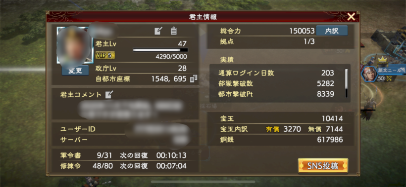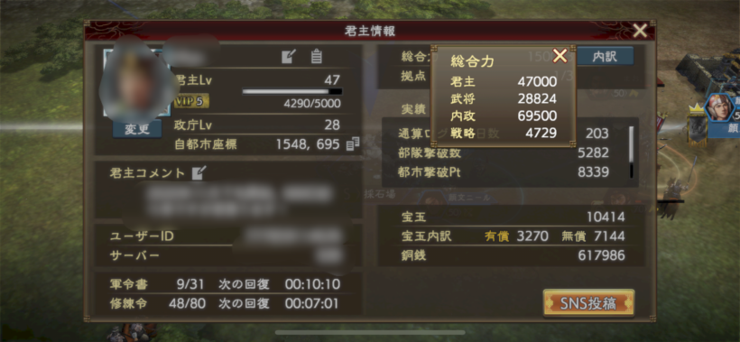 これも君主総合力150,000突破までに29,000以上にしたかったのですがなかなか上がらず・・・。