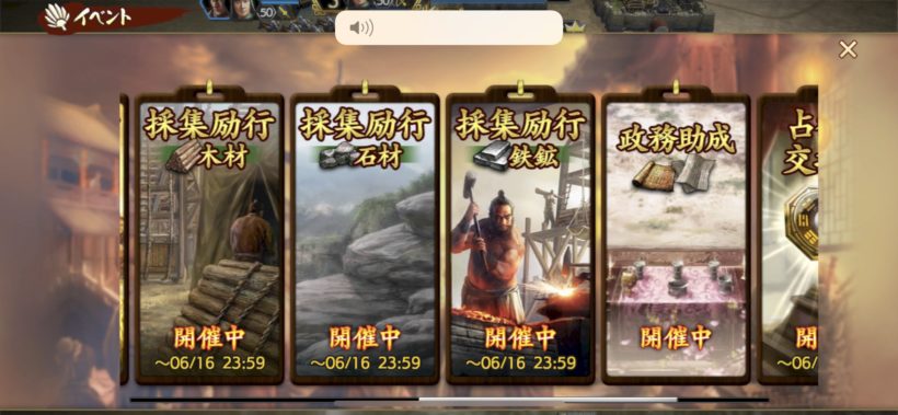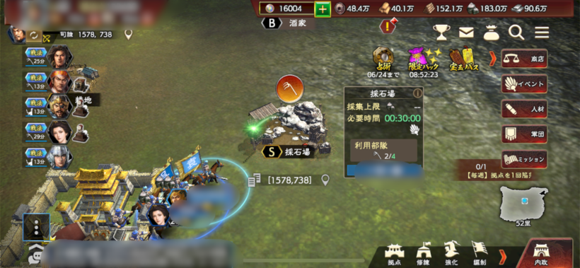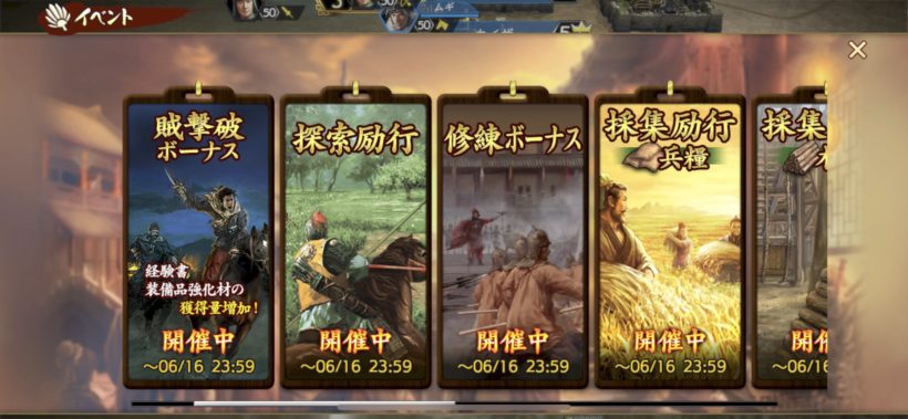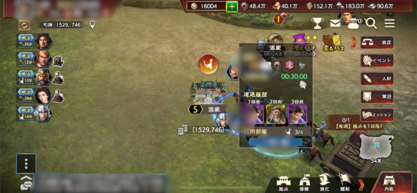 例えば、Sランク採集では通常2時間がイベントで1時間に、洛陽を保持している軍団は洛陽利権で司隷地域の探索、採集の時間半減なので30分に。