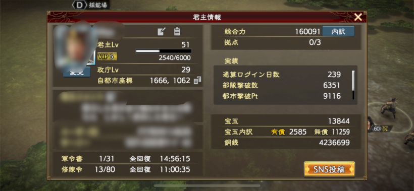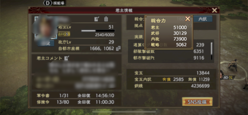 内訳の武将も30,000は突破していますし結構育っています。が、5部隊なのでそこまで強くない。