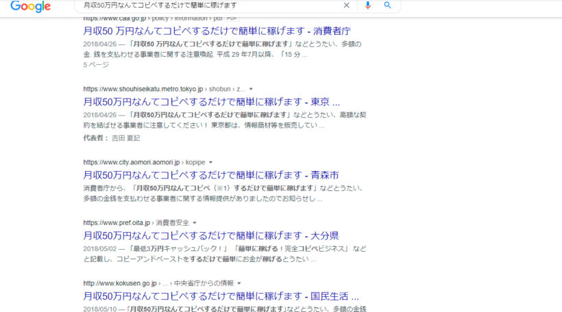 「月収50万円なんてコピペするだけで簡単に稼げます – 消費者庁」で検索したらいろんな機関が推奨しているように見える不思議笑。