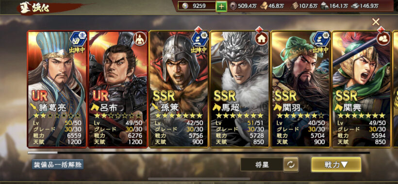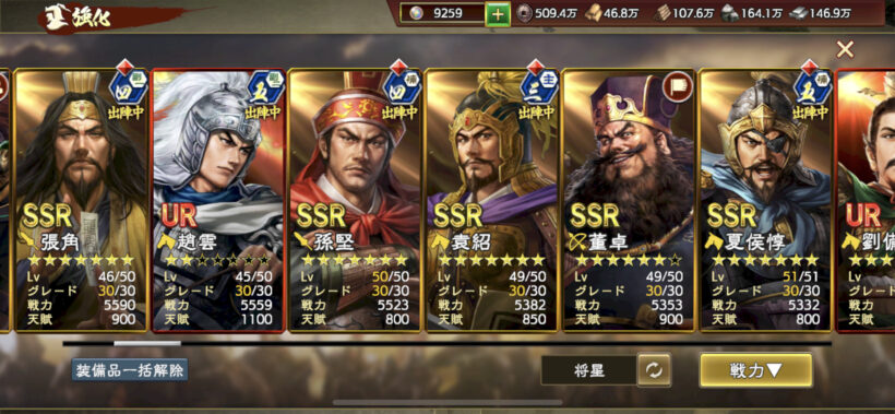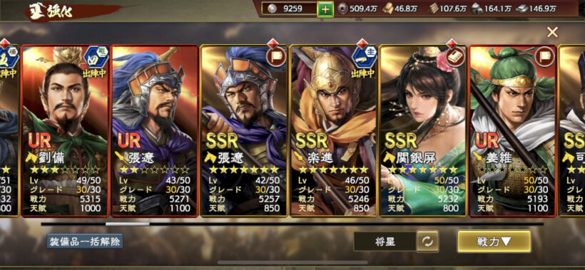 武将の星を重ねることはできる状態ですが、銅銭がなかなか足りないのと、修練も追いつかずに水晶が足りません。