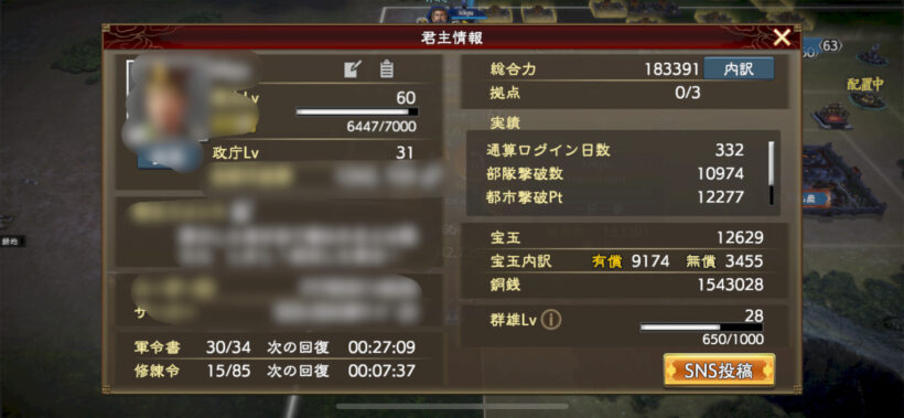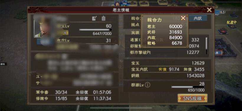 君主レベルも60になりました。