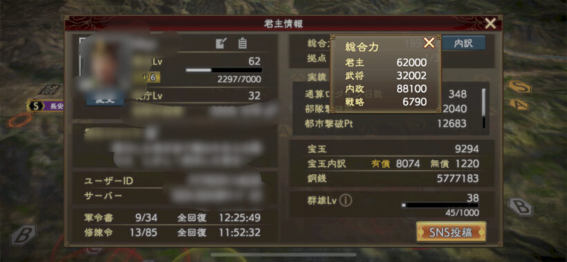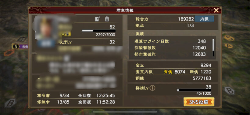できる範囲で無理せずにやっていこうとは思います。次は君主総合力190,000と武将値32,500が目標です。