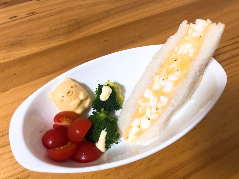 食パンにマヨネーズを薄く塗って、たまごサラダを乗せて伸ばしてもらい、私が少し整えて食べやすく切ったら出来上がり!