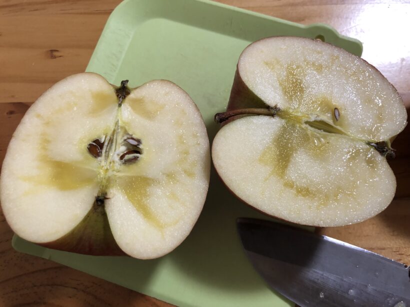 しかし、りんごが完熟すると、ソルビトールは糖分に変換するのをやめてしまい、そのままの状態で蓄積されます。これがりんごの「蜜」の正体です。