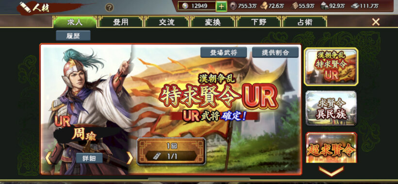 ガチャ引く前のスクショとった時に出ていた周瑜が出てきました。