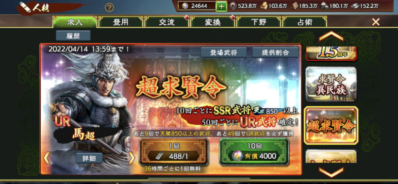 ということで、今回は新しいUR武将の馬超と夏侯惇を求めてガチャを回したよというお話。
