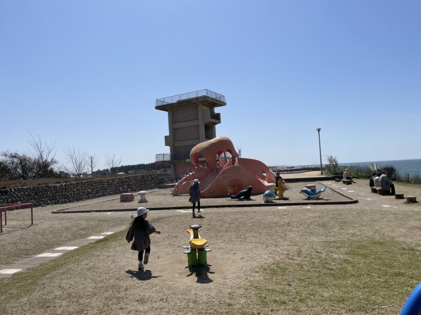 子どもたちも喜んでいました…が、このタコ型滑り台は階段がなく、梯子のようなアスレチックっぽい登り口しかないので小さい子どもには厳しい遊具です。