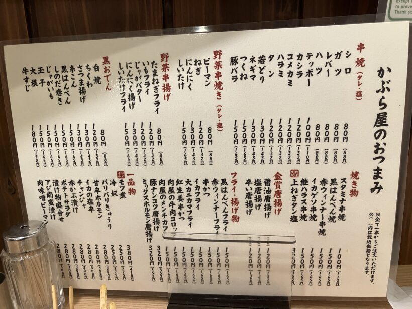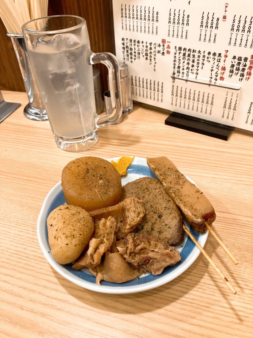 おでん8種、串焼き5種、モツ煮食べました。めちゃ食べてますね。