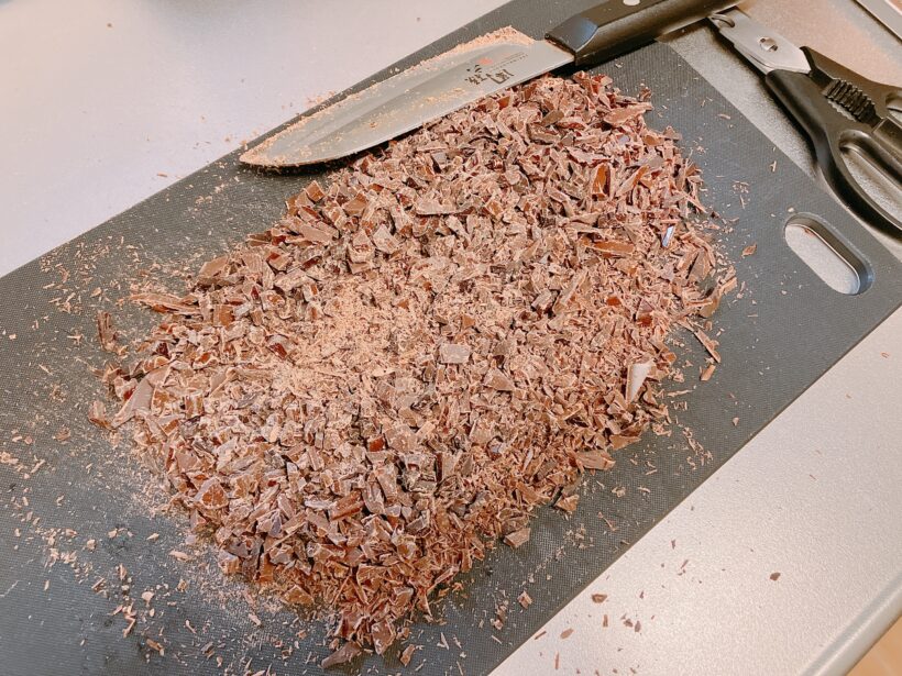 チョコレートを刻んで溶かしやすくします。