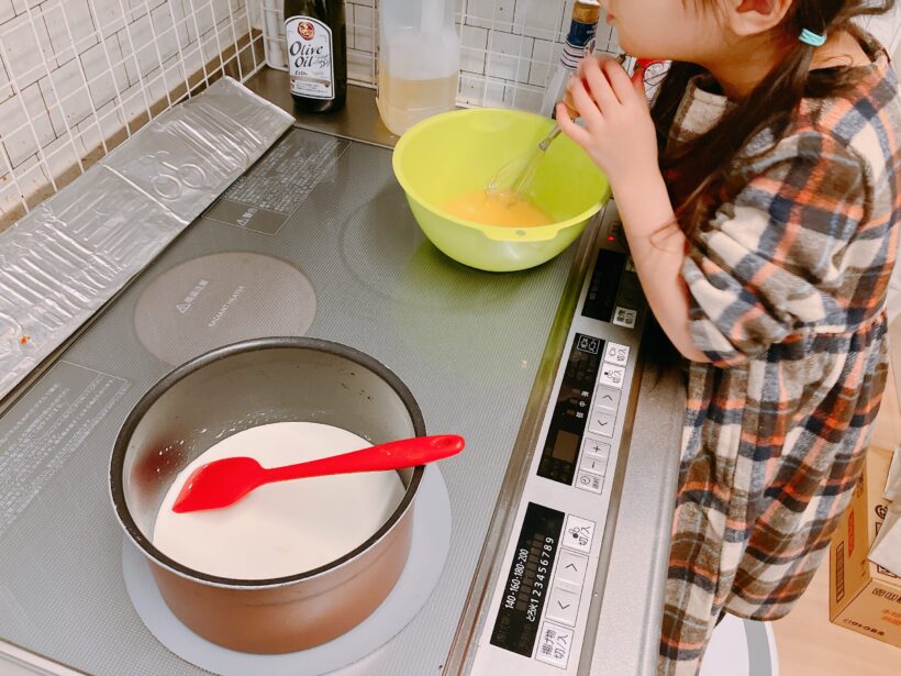 子どもにはたまご割って混ぜてもらうお手伝いを。(1個床に落として犠牲になりましたが…笑)