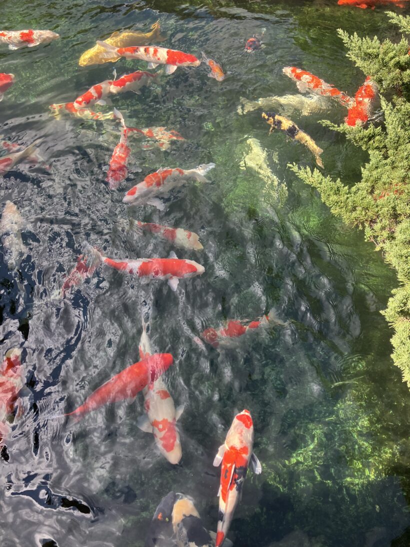 まだ餌撒いてないのに、人間が水槽の近くに来ると大量の大きな鯉が自然と寄ってきます。