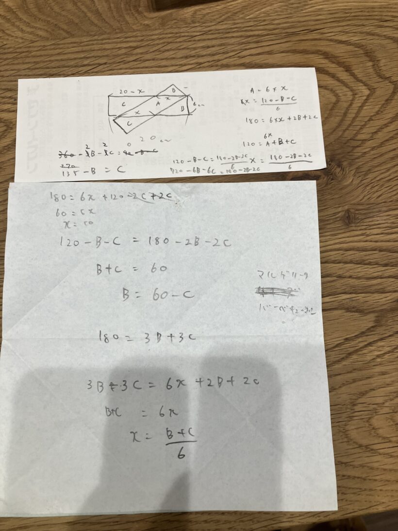数学は好きだったのでこういうの見ると解きたくなってしまい、子どもの折り紙とレシートの裏に書いた計算式