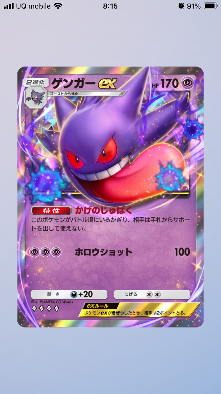 バトル場なのでベンチだとダメっぽいですけど、それでもエネルギー3つで100ダメージだし、こちら側に快復手段があれば相手の場のポケモンによっては最後までゲンガーで倒し来ることもできるかもしれない