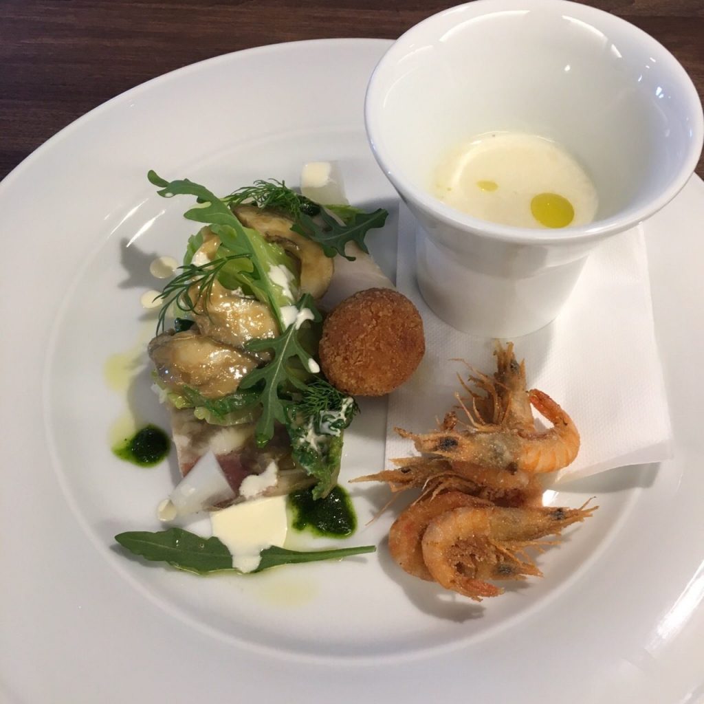 エビのフリッター、じゃがいものスープ、煮こごり?のテリーヌっぽいもの、鶏ハム、肝で和えた貝、でした。