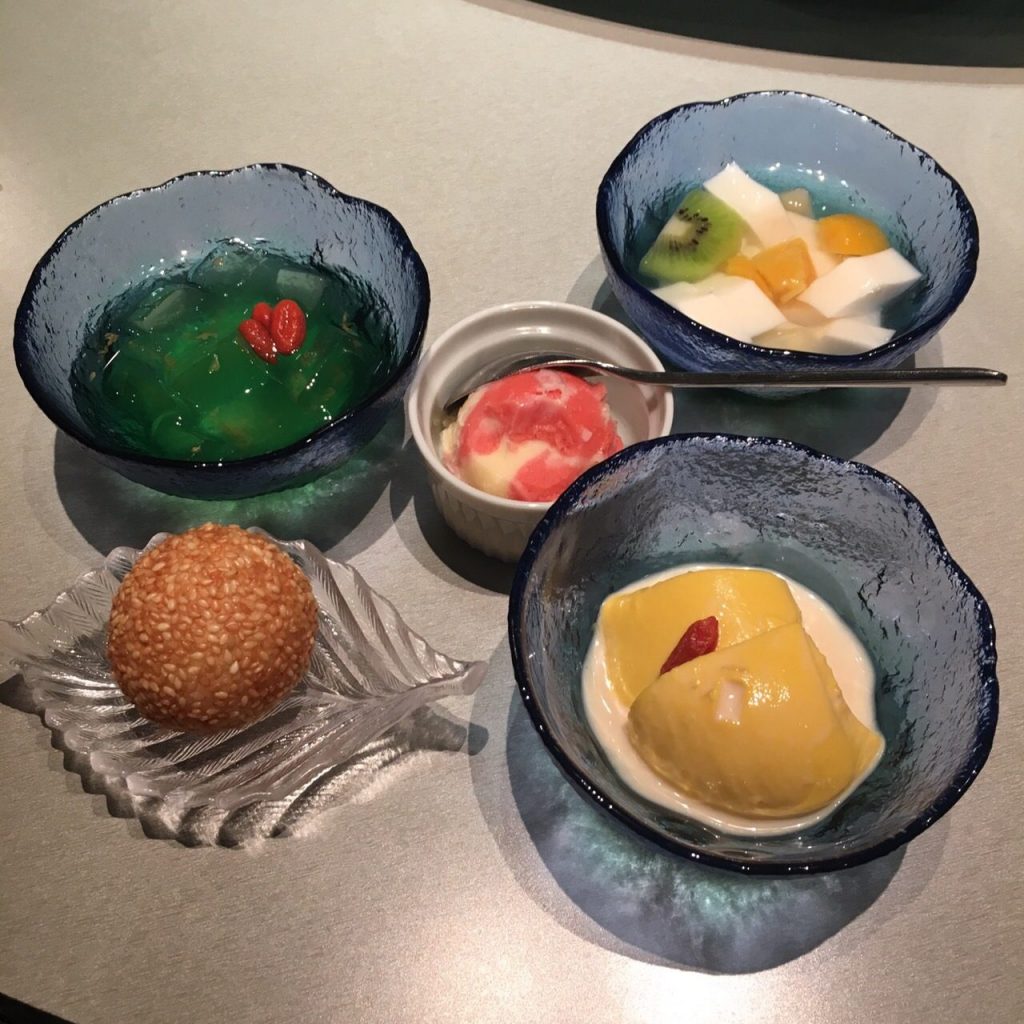 杏仁豆腐、マンゴープリン、胡麻団子、豆乳イチゴアイス、なんちゃらゼリー、です。