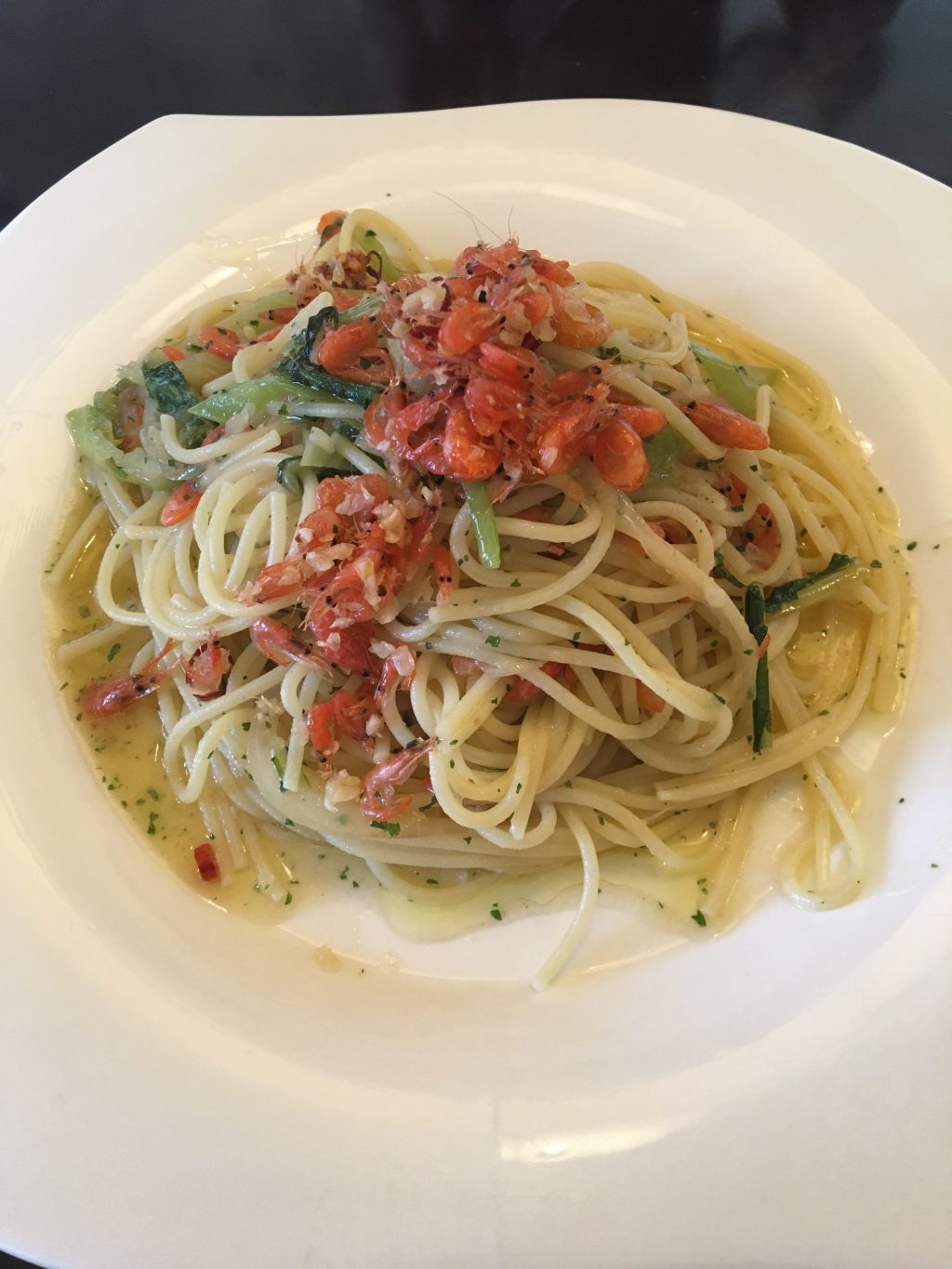 私は桜えびのペペロンチーノ(大盛り+100円)、嫁はピリ辛ソーセージのトマトパスタを選択。