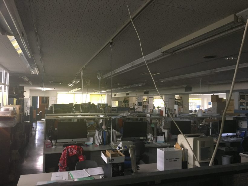 出勤はDTP、本部長、製版だけなので、フロアは暗いです。
