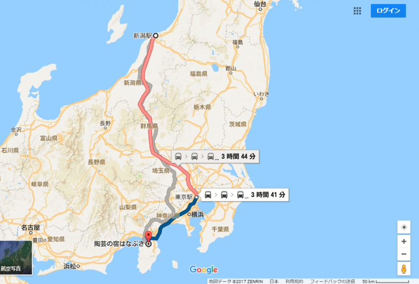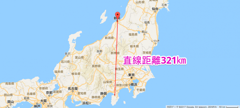 新潟駅からはなぶさ旅館まで、直線距離で約321㎞。