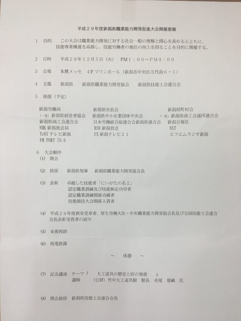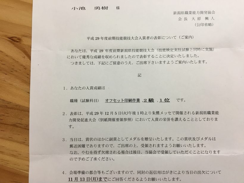 あなたは、平成29年度前期新潟県技能競技大会(技能検定実技試験と同時に実施)において優秀な成績を収められたので表彰することに決定いたしました。