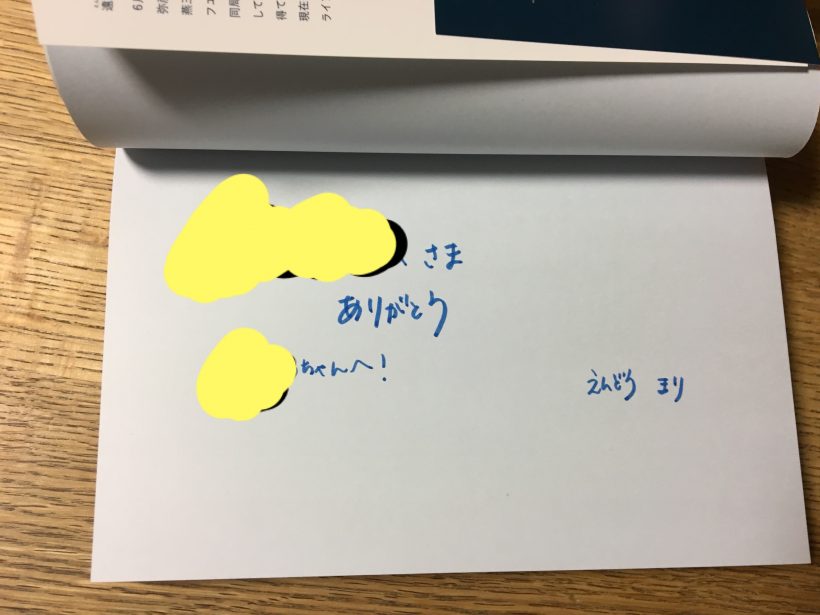 サインは事前に渡された紙に自分の名前を書いて、麻理さんに渡してサインしてくれます。まぁ奥さんの名前を書きましたけど笑。それにプラスして、娘をみて名前をきいてくれたんですが、娘の名前も本に書いてくれました。