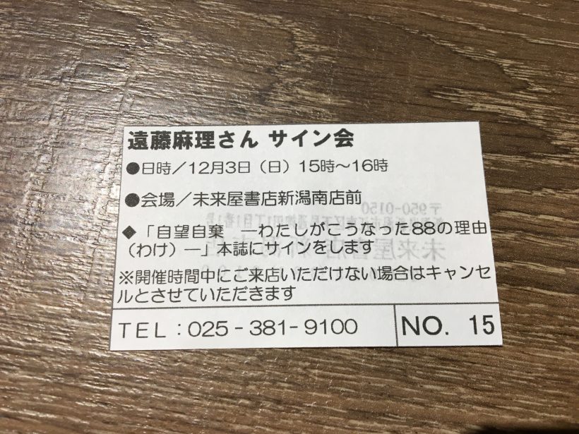 電話で未来屋書店に問い合わせたところ、15時からの開始前に13時から先着50名で整理券を配布と言われました。