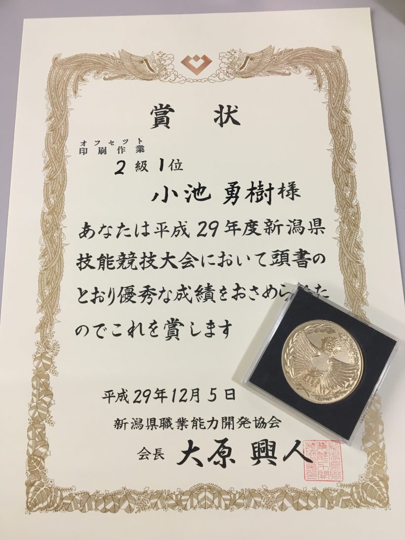 「新潟県技能競技大会 印刷技能士2級」で、「1位」らしいです笑