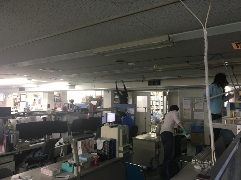 天井のすす払い、蛍光灯を替えたり拭いたり、窓ガラス磨き、PCのキーボードの間に入った埃をコンプレッサーで除去、加湿器のフィルター掃除等々・・・。